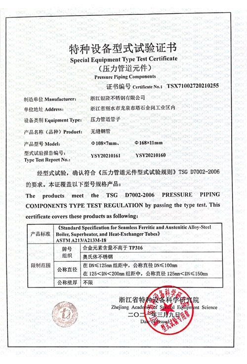 浙江銀隆不銹鋼有限公司創始于2006年,是一家專業生產不銹鋼無縫管的企業。公司位于浙江麗水市,企業注冊總資金貳億壹仟柒佰肆拾玖萬元,擁有4家工廠,占地總面積11萬平方米,職工530人,年產不銹鋼無縫管5萬噸。